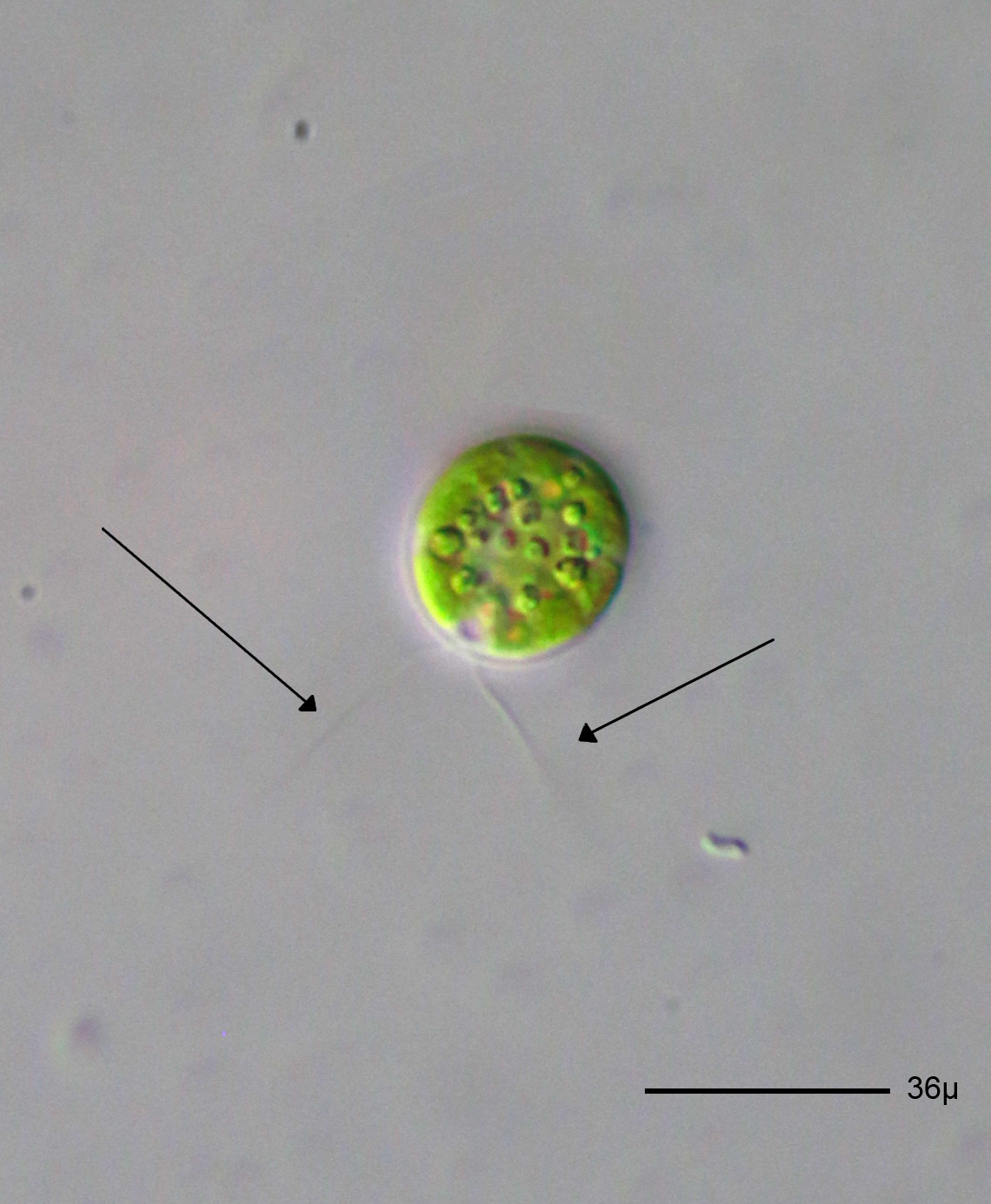Chlamydomonas globosa (Chlorophyceae). Foto de microscopia, as setas apontam os flagelos. Foto: Picturepest / via Wikimedia Commons / CC-BY-SA 2.0