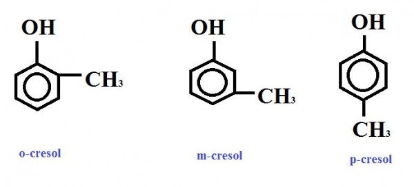 Existem três formas isômeras do cresol: o orto-cresol (o-cresol ou 2-metil-fenol), o meta-cresol (m-cresol ou 3-metil-fenol) e o para-cresol (p-cresol ou 4-metil-fenol), que se diferem apenas pela posição do radical metil (CH3) no anel aromático e podem ser encontradas separadamente ou combinadas. Estes isômeros também possuem propriedades diferentes, como, por exemplo, o ponto de fusão, que do o-cresol é de 31 °C, 10,9 °C do m-cresol e 34 °C do p-cresol.