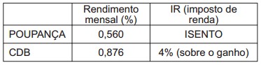 Um jovem investidor precisa escolher qual investimento lhe trará maior retorno financeiro em uma aplicação de R$ 500,00. Para isso, pesquisa o rendimento e o imposto a ser pago em dois investimentos: poupança e CDB. As informações obtidas estão resumidas no quadro: