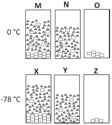 Em um experimento, determinadas massas de ácido maleico e acetona foram misturadas a 0 °C, preparando‐se duas misturas idênticas. Uma delas (X) foi resfriada a ‐78 °C, enquanto a outra (M) foi mantida a 0 °C. A seguir, ambas as misturas (M e X) foram filtradas, resultando nas misturas N e Y. Finalmente, um dos componentes de cada mistura foi totalmente retirado por destilação. Os recipientes (marcados pelas letras O e Z) representam o que restou de cada mistura após a destilação. Nas figuras, as moléculas de cada componente estão representadas por retângulos ou triângulos.