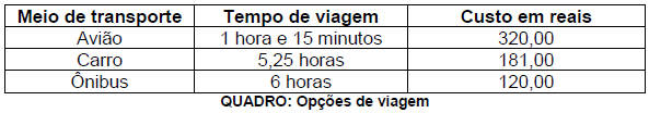 Renato trabalha como tradutor e, em média, seu rendimento por hora de trabalho é de R$ 85,00. Ele precisa viajar regularmente de Curitiba para São Paulo, tendo três maneiras de fazer essa viagem, conforme mostra o Quadro abaixo.
