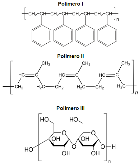 Após analisar as estruturas dessas substâncias, o químico concluiu que os polímeros I, II e III são solúveis, respectivamente, nos seguintes solventes:
