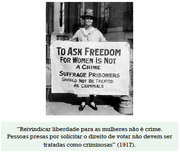 A imagem acima retrata a luta das mulheres pelo sufrágio universal nas décadas iniciais do século XX, nas sociedades norte-americana e europeia.