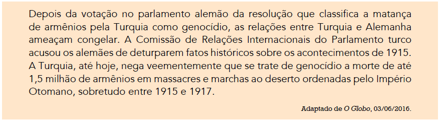 De acordo com o texto acima, o posicionamento do governo turco indica o temor de possíveis punições, especialmente se esse organismo internacional conceber o massacre dos armênios como um ato deliberado de: