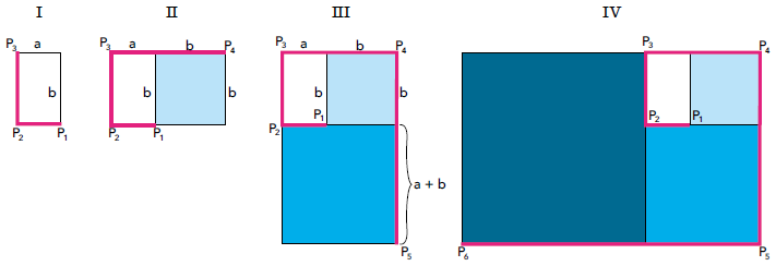 A figura IV destaca a linha poligonal P1P2P3P4P5P6, formada pelos lados dos retângulos, que são os elementos da sequência (a, b, a + b, a + 2b, 2a + 3b).