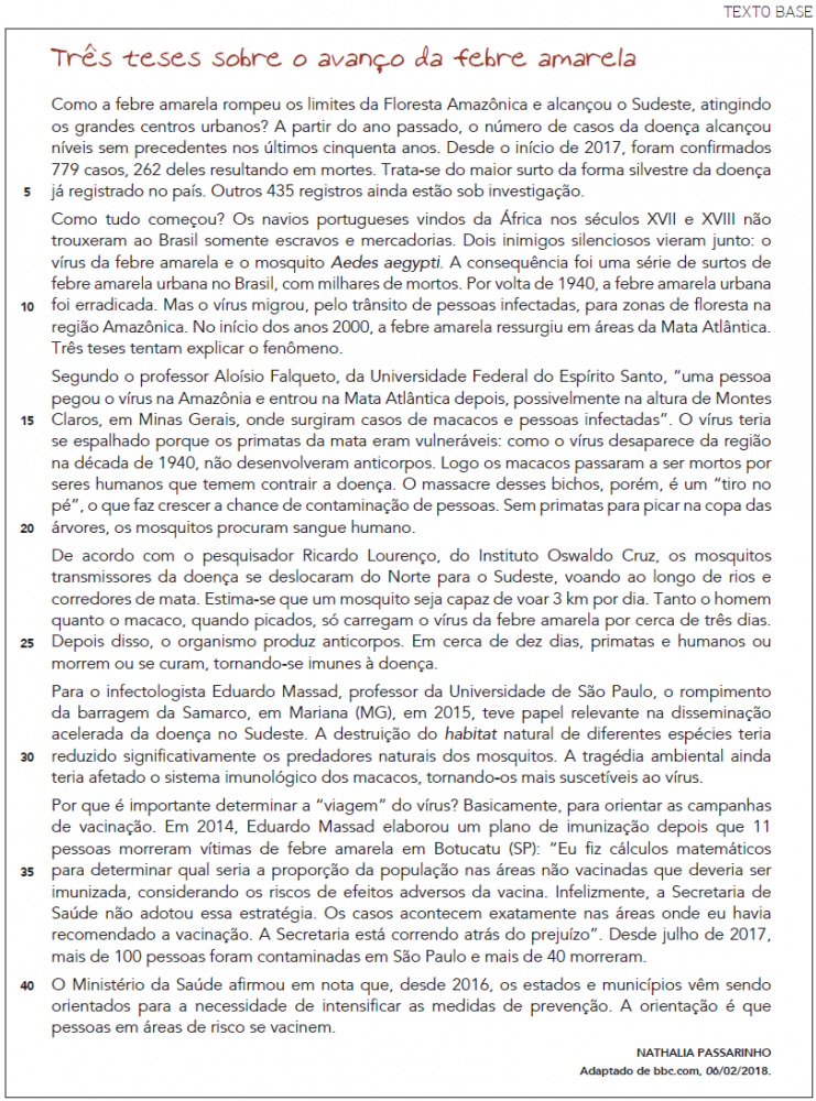 Tanto o homem quanto o macaco, quando picados, só carregam o vírus da febre amarela por cerca de três dias. Depois disso, o organismo produz anticorpos. (l. 23-25)