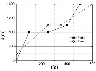 Pedro e Paulo diariamente usam bicicletas para ir ao colégio. O gráfico abaixo mostra como ambos percorreram as distâncias até o colégio, em função do tempo, em certo dia.