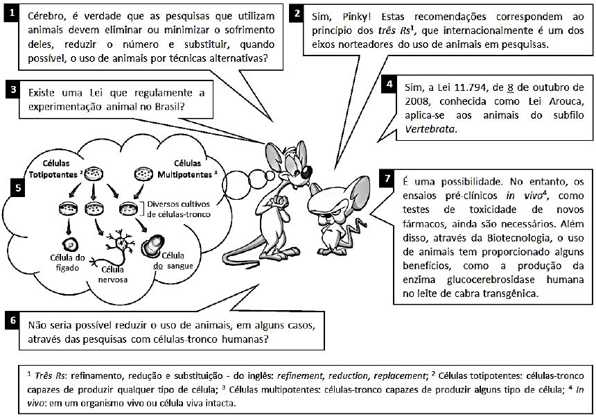 A figura abaixo apresenta uma suposta conversa entre os personagens do desenho animado Pinky & Cérebro sobre o uso de animais em pesquisas científicas.