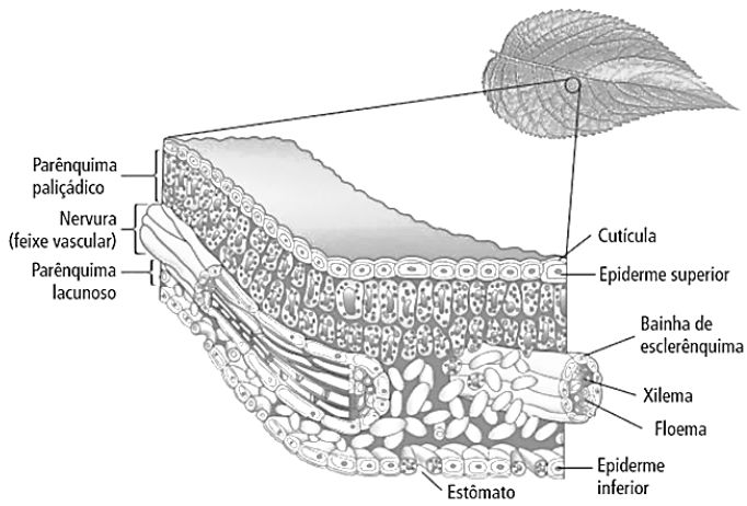 Na maioria das plantas, a folha é o principal órgão fotossintético. As estruturas histológicas de uma folha vegetal são mostradas esquematicamente na figura abaixo.