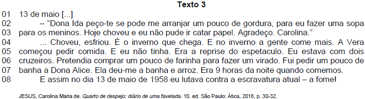 Com base na leitura do Texto 3 e na leitura integral da obra Quarto de despejo: diário de uma favelada, publicada pela primeira vez em livro em 1960, no contexto sócio-histórico e literário e, ainda, de acordo com a variedade padrão da língua escrita, é correto afirmar que:
