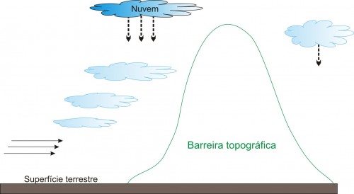 É originada quando uma massa de ar úmido que se desloca, encontra uma barreira topográfica (serra, montanha, etc), e é forçada a elevar-se, ocorrendo queda de temperatura seguida da condensação do vapor d’água e formação de nuvens. Chuvas orográficas apresentam pequena intensidade, e longa duração. Veja abaixo um esquema de como ocorrem: