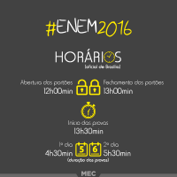 Os portões de acesso abrem às 12h e fecham às 13h, horário de Brasília. O MEC recomenda que os participantes cheguem ao local de prova até às 12h (horário oficial de Brasília).