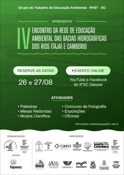 O evento é uma realização do Câmpus Gaspar do Instituto Federal de Santa Catarina (IFSC) e instituições que fazem parte do grupo de trabalho de Educação Ambiental das Bacias Hidrográficas dos Rios Itajaí e Camboriú por meio do Edital Provento 2021 Fapesc.