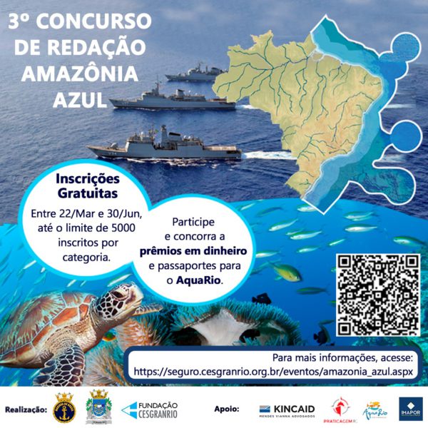 A Marinha do Brasil e a Sociedade dos Amigos da Marinha do Rio de Janeiro (RJ) estão com as inscrições abertas para o 3º Concurso de Redação Amazônia Azul. As inscrições são gratuitas e podem ser efetuadas por todas as pessoas interessadas no portal Fundação Cesgranrio, até às 23h59 de 30 de junho de 2021.