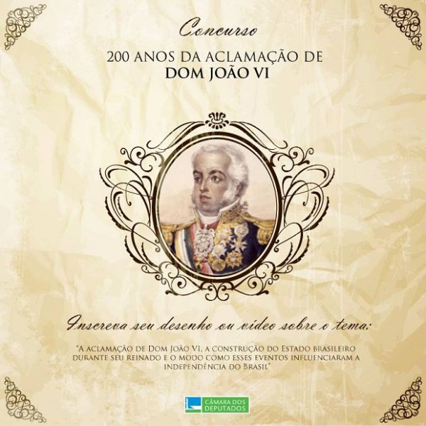 A Câmara dos Deputados encerra na próxima sexta-feira (06) as inscrições para os concursos de Desenho e Vídeo sobre o tema "A Aclamação de Dom João VI - a construção do Estado brasileiro durante seu reinado e o modo como esses eventos influenciaram a independência do Brasil".