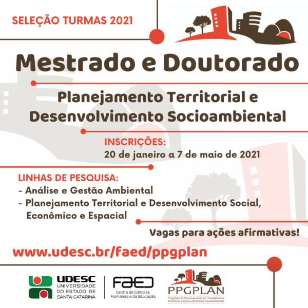 O Programa de Pós-Graduação em Planejamento Territorial e Desenvolvimento Socioambiental (PPGPlan) da Universidade do Estado de Santa Catarina (Udesc) está com as inscrições abertas para turmas de 2021 dos cursos de mestrado e doutorado.