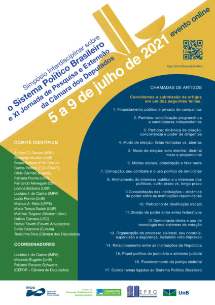 O Instituto de Matemática Pura Aplicada (IMPA), em parceria com a Câmara dos Deputados e a Universidade de Brasília (UnB), realizarão de forma online, entre os dias 5 e 9 de julho de 2021, o Simpósio Interdisciplinar sobre o Sistema Político Brasileiro e a XI Jornada de Pesquisa e Extensão da Câmara dos Deputados.