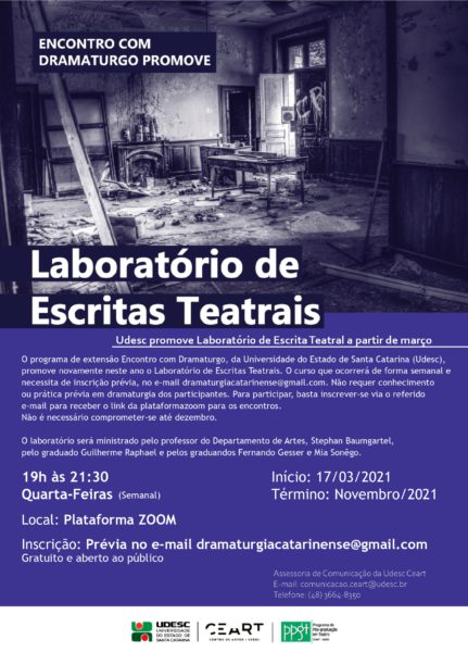 O Programa de Extensão Encontro com Dramaturgo, do Centro de Artes da Universidade do Estado de Santa Catarina (UDESC), realizará neste ano de 2021, o Laboratório de Escritas Teatrais.