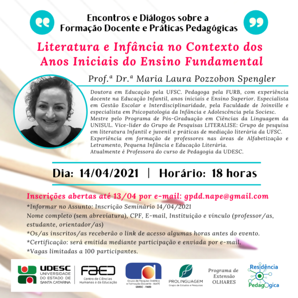 O evento faz parte da série Encontros e Diálogos sobre a Formação Docente e Práticas Pedagógicas. O tema abordado neste encontro será ministrado pela professora do curso de Pedagogia - Udesc/Faed, Maria Laura Pozzobon Spengler.