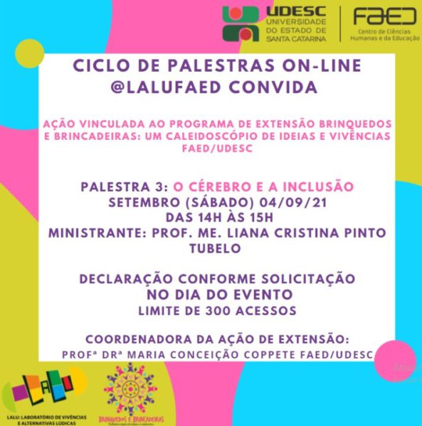Nesta palestra, o tema abordado será "O cérebro e a inclusão". Entre os assuntos a serem abordados estão fisiologia cerebral; supercérebros e deficiências; neuroplasticidade transmodal e crossmodal; práticas inclusivas que pensam o sujeito de aprendizagem em suas potencialidades. A palestra será ministrada pela professora Liana Cristina Pinto Tubelo.