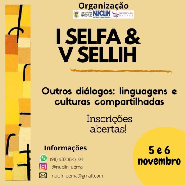O Núcleo de Línguas NUCLIN e o Programa de Pós-Graduação em Letras da Universidade Estadual do Maranhão (UEMA) estão promovendo, o I Seminário de Língua, Ficção e Arte (SELFA) e o V Seminário de Língua e Literatura Hispano-Americana (SELLIH).