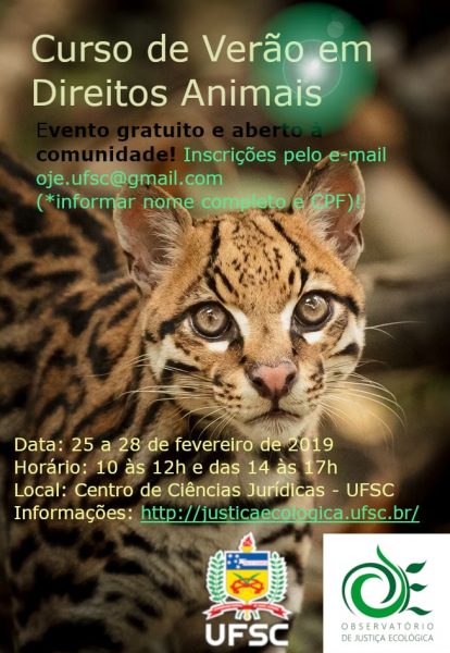 O projeto Observatório de Justiça Ecológica (OJE) por meio do Programa de Pós-Graduação em Direito da Universidade Federal de Santa Catarina (PPGD/UFSC), promoverá nos dias 25, 26, 27 e 28 de fevereiro o "Curso de Verão em Direitos Animais".