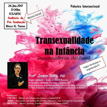 A Universidade Federal de Santa Catarina (UFSC) receberá no dia 26 de junho a Pesquisadora britânica Zowie Davy para ministrar a palestra "Transexualidade na Infância". O encontro é aberto ao público em geral e as inscrições são gratuitas.