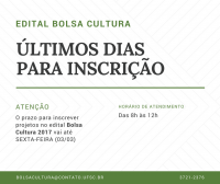 A Secretaria de Cultura e Arte (SECARTE) da Universidade Federal de Santa Catarina (UFSC) prorrogou até dia 6 de março o prazo final para as inscrições do Bolsa Cultura 2017. O programa é voltado para estudantes e professores da UFSC.