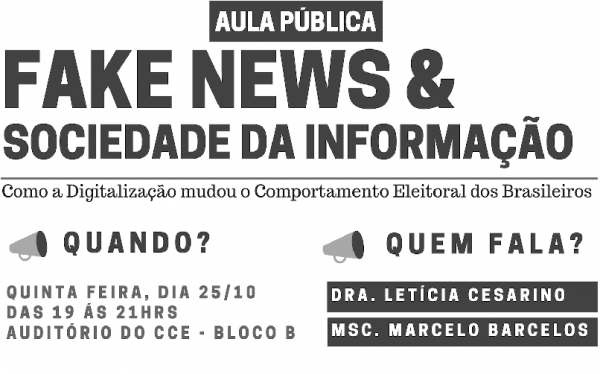 A Universidade Federal de Santa Catarina (UFSC) por meio do Centro Acadêmico de Ciência da Informação (CACINF) e do Centro Acadêmico Livre de Ciências Sociais (CALCS), realizam nesta quinta-feira (25) no Câmpus Florianópolis, das 19h às 21h, a aula pública sobre "Fake News e Sociedade da Informação - como a digitalização mudou o comportamento eleitoral dos brasileiros".