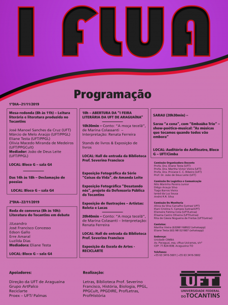 "Além de fomentar e congregar atividades artísticas diversas, como a música, as artes visuais, o teatro, o artesanato, entre outros. Acredito que a Flua (Feira Literária da Universidade Federal de Tocantins), nos dois dias de sua realização, torna-se um espaço de convivência e difusão da cultura local e do Estado, já que receberemos artistas de algumas cidades do Tocantins e da comunidade araguainense, tendo em vista que a Feira é gratuita e aberta à comunidade", declarou a coordenadora geral do evento e professora, Eliane Testa.