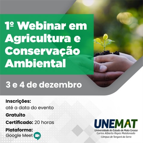 Mestrandos do Programa de Pós-Graduação em Ambientes e Sistemas de Produção Agrícola (PPGasp) da Universidade do Estado de Mato Grosso (UNEMAT), realizarão nos dias 3 e 4 de dezembro, o I Webinar em Agricultura e Conservação Ambiental. Os interessados em participar podem se inscrever gratuitamente até hoje (3) no portal.