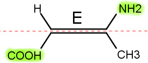 Para haver a notação E/Z a cadeia deve apresentar dois carbonos com pelo menos três ligantes diferentes entre si e neste caso a nomenclatura cis/trans seria insuficiente. Para esta notação devemos analisar os números atômicos dos átomos envolvidos. Quando os átomos de maior número atômico estiverem para o mesmo “lado” utilizamos a nomenclatura E (Entgegen que siginifica “opostos” em alemão) e se estiverem para lados opostos utilizamos a nomenclatura Z (Zusammen que significa “juntos” em alemão). Como no caso da figura abaixo: